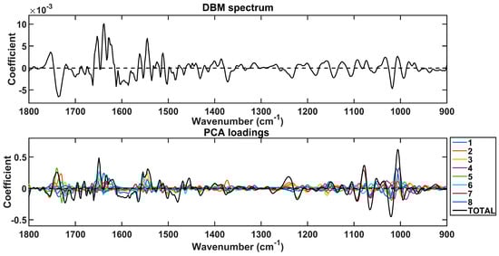 Difference-between-mean (DBM) spectrum and PCA loadings on the 8 PCs used to build the PCA-QDA model. The “TOTAL” stands for the sum of coefficients in the 8 PCs.
