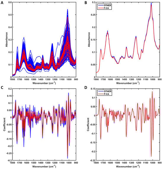 Mid-infrared (IR) spectra derived using ATR-FTIR spectroscopy. (A) Raw IR spectra for all samples in each group (prostate cancer [P-CA] or other conditions for male patients [OTHER]); (B) average raw IR spectra for each group (prostate cancer [P-CA] or other conditions for male patients [OTHER]). (C) Preprocessed (SG 2nd derivative followed by vector normalisation) IR spectra for all samples in each group (prostate cancer [P-CA] or other conditions for male patients [OTHER]); (D) average preprocessed IR spectra for each group (prostate cancer [P-CA] or other conditions for male patients [OTHER]).