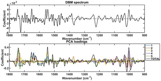 Difference-between-mean (DBM) spectrum and PCA loadings on the 5 PCs used to build the PCA-QDA model. The “TOTAL” stands for the sum of coefficients in the 5 PCs.