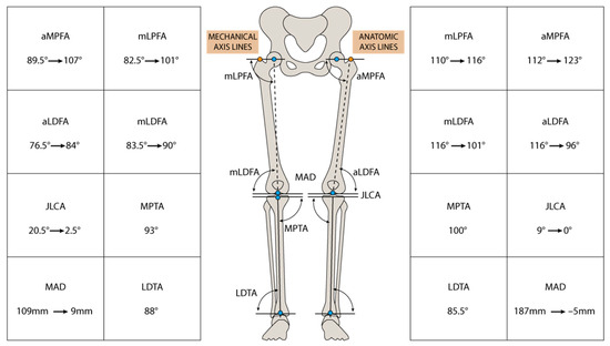 - Lee, K.M.; Chang, C.B.; Park, M.S.; Kang, S.B.; Kim, T.K.; Chung, C.Y. Changes of Knee Joint and Ankle Joint Orientations after High Tibial Osteotomy. Osteoarthr. Cartil. 2015, 23, 232–238. [Google Scholar] [CrossRef] [PubMed]