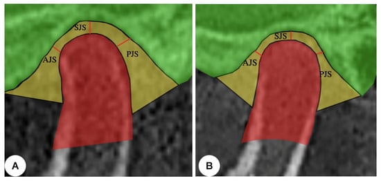 TMJ sagittal view of the anterior joint space (AJS), superior joint space (SJS), and posterior joint space (PJS) during the pre-surgical diagnostic stage (A) and at post-surgical (B) follow-up after orthognathic surgery.