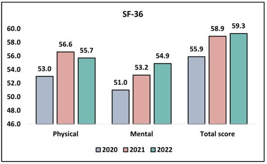 Lastly, the analysis of the total score from the SF-36 survey indicated an upward trajectory in the perceived health status and quality of life over the three years. The mean score exhibited a climb from 55.9 ± 8.9 in 2020 to 58.9 ± 8.0 in 2021, with a slight further increase to 59.3 ± 8.8 in 2022. Although this trend suggests a possible enhancement in the overall quality of life throughout the pandemic years, this change was not statistically significant, as seen in Table 4 and Figure 1.
