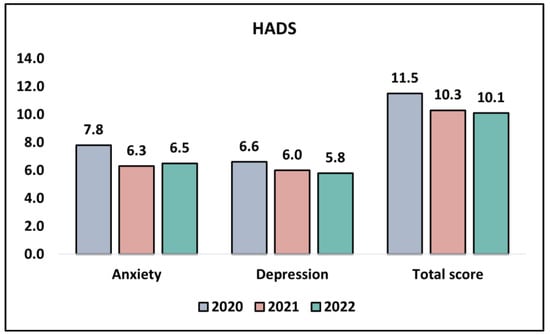 Lastly, analyzing the total score from the HADS survey (the aggregate of both the anxiety and depression scores), a gradual decrease was evident from 11.5 in 2020 to 10.3 in 2021, with a further slight reduction to 10.8 in 2022. This trend potentially suggests a decrease in the overall levels of distress among the study participants during the pandemic years. Nevertheless, this change was not statistically significant, with a p-value of 0.541, as presented in Table 5 and Figure 2.