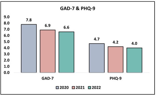 A scrutiny of the GAD-7 survey results, which is designed to identify potential cases of generalized anxiety disorder, presents a discernible downward trend over the years of the study. In 2020, the participants registered a mean score of 7.8 ± 2.5, which decreased to 6.9 ± 2.2 in 2021 and further to 6.6 ± 2.8 in 2022 (p = 0.034). This could potentially signify that the participants experienced a diminution in anxiety symptoms, possibly reflecting adaptive responses or coping strategies that were developed over the period of the pandemic. Turning to the PHQ-9 survey results, which assess the severity of depression symptoms, a marginal decrease in mean scores is observed from 4.7 ± 2.2 in 2020 to 4.2 ± 2.6 in 2021, further decreasing to 4.0 ± 2.3 in 2022. However, this decreasing trend is not statistically significant (p = 0.276), as presented in Table 6 and Figure 3.