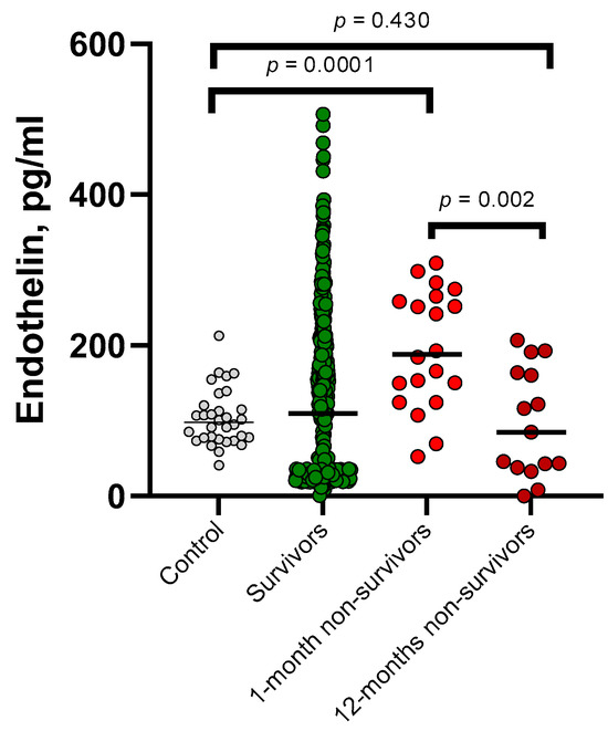 The plasma concentration of endothelin in survivors (n = 435), 1-month non-survivors (n = 20), 12-month non-survivors (n = 15), and healthy controls (n = 35) was analyzed and compared.