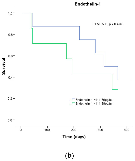Furthermore, patients in the survived and deceased groups within 12 months had a comparable incidence of chronic diseases affecting ET-1 levels (hypertension, diabetes mellitus, coronary heart disease, heart failure, chronic kidney disease), and their basal ET-1 levels were unknown. Henkens M. et al. reported that pre-existing comorbidities, commonly found in older people, make a minimal contribution to in-hospital mortality compared to age. Moreover, the contribution of comorbidities to outcomes in <60-year-old patients was restricted only to cardiovascular disease and had no significant association with diabetes, CKD, and COPD [43].