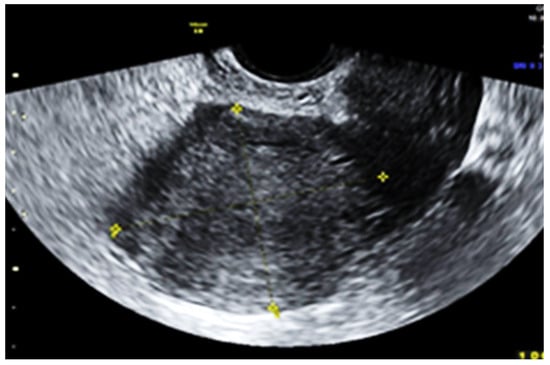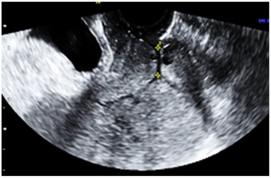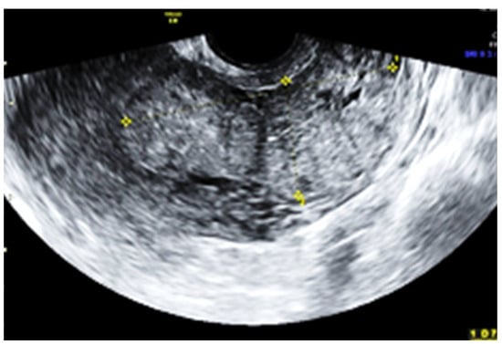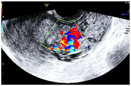 The patient had a favorable postoperative recovery with normal vaginal bleeding, leading to her discharge after five days. No immediate postpartum ultrasound was performed because the patient had a normal evolution in the first postoperative days, without quantitatively abnormal vaginal bleeding and with normal uterine involution. From hospital discharge, she visited the hospital daily to breastfeed her baby until the infant reached a weight of 2500 g, at which point both mother and baby were able to go home. However, later on, she experienced a significant episode of delayed postpartum hemorrhage, occurring six weeks after giving birth. The patient reported an intermittent small amount of vaginal bleeding during this period. During the clinical bimanual examination, an enlarged uterus of approximately 12–13 cm with a soft consistency was detected.