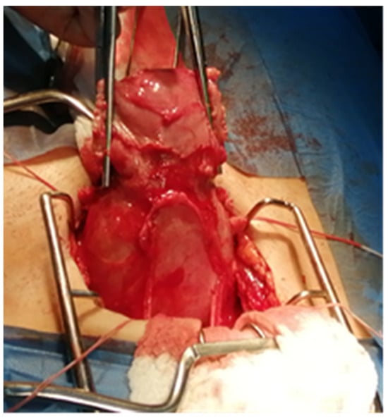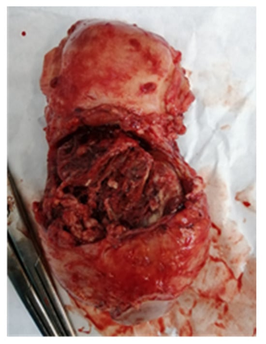 Subsequently, the patient was readmitted to the hospital. Responding to her request, we attempted a conservative treatment approach by performing curettage under ultrasound guidance. Frozen sections taken during the procedure did not indicate any evidence of trophoblastic disease—it was normal placental tissue. However, during the maneuver, we observed the increased adhesion of the proliferated placental tissue to the posterior uterine wall. Unfortunately, due to the occurrence of massive bleeding during the curettage, a total hysterectomy was necessary. Additionally, to provide adequate compression, three vaginal meshes were introduced until the uterus was removed. During the surgery, the uterus was found to be extremely fragile (Figure 5), with a posterior rupture at the isthmus level (Figure 6), where the placental invasion extended up to the uterine serosa.