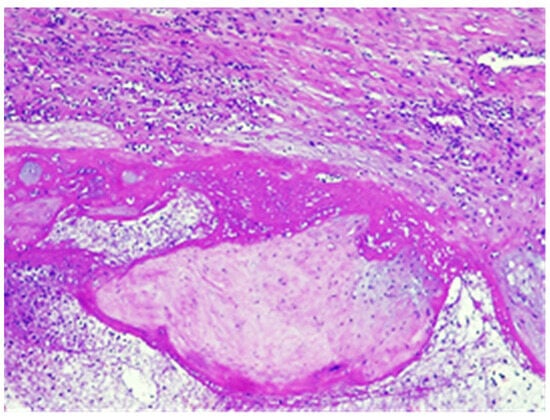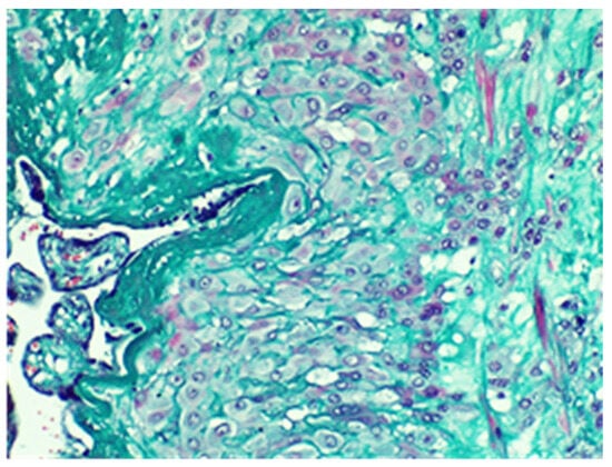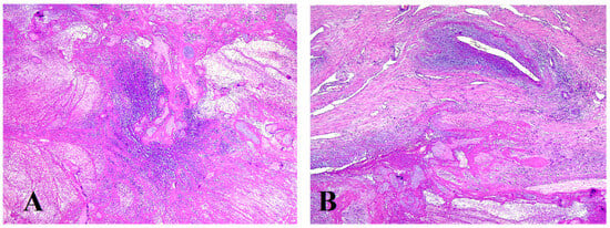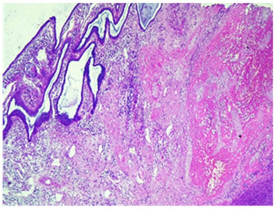 The conclusive histological examination demonstrated placenta increta (Figure 7 and Figure 8) within the uterine cavity and cervical canal (Figure 9). Degenerative necrotic changes (Figure 10A,B) and acute inflammation were also observed.