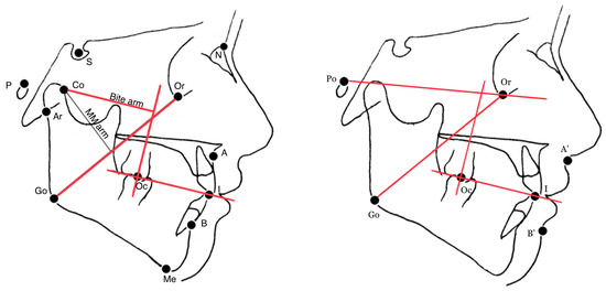 The goal of orthodontic treatment is to achieve neuromuscular balance and a stable occlusion [1]. The performance of the masticatory muscles is one of the functional variables that can be altered by orthodontic and surgical modification of the dental arch and craniofacial skeleton [2]. The assessment of the actual bite force is difficult because bite force sensors often interfere with occlusion and the relationship between electromyographic signals and bite force is nonlinear [3]. Except for relatively complex imaging techniques such as computed tomography, magnetic resonance imaging, and ultrasound which cannot be performed extensively, biomechanical models from conventional radiographs are primarily used. In these models, muscle forces and occlusal resistance are estimated from geometric variables measured against tooth and skeletal landmarks [4,5,6,7]. For this purpose, the mechanical advantage of the masticatory muscles is determined, specifically the ratio of the muscle moment arm to the occlusal force moment arm.