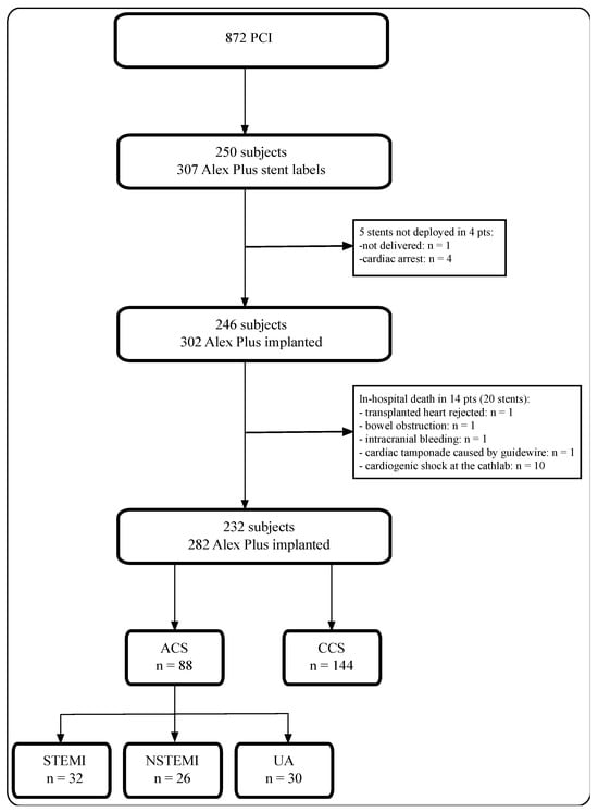In the reporting time frame, we retrieved data on 872 PCI procedures. For the final analysis, we included 232 patients among whom 282 Alex Plus stents had been implanted, as described previously in detail [16]. We identified 88 patients with ACS (STEMI—32, NSTEMI—26, UA—30) and 144 patients with CCS (Figure 1).