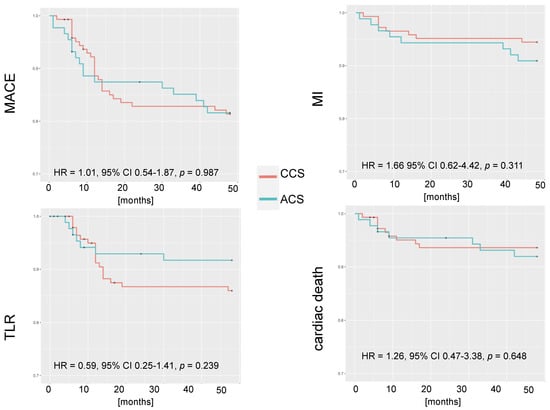 Kaplan–Meier curves regarding event-free survival in ACS and CCS subgroups. ACS—acute coronary syndrome; CCS—chronic coronary syndrome; MACE—major adverse cardiovascular events; MI—myocardial infarction; TLR—target lesion revascularization.
