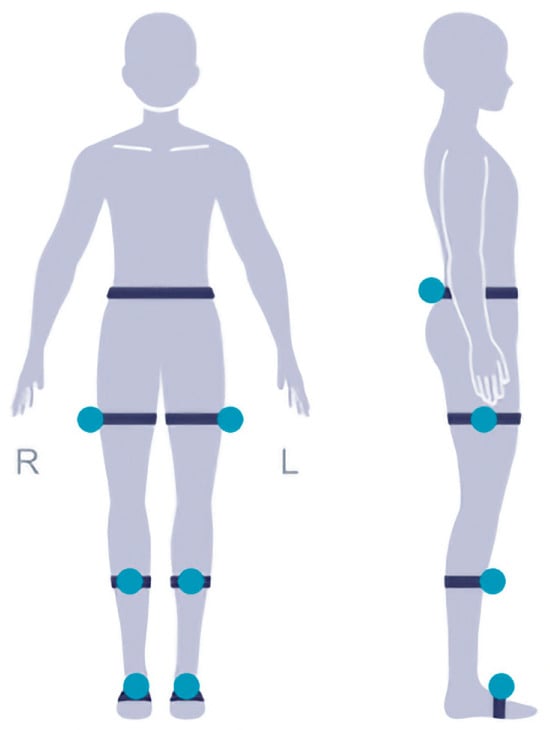 The figure demonstrates the positioning of the external reflective sensors used for gait analysis. Reflective sensors were placed at the waist and three lower limb joints on one side of the body. These sensors allowed for precise measurement of kinematic data during walking, enabling the assessment of gait characteristics and mobility parameters in patients with degenerative lumbar scoliosis (DLS) and lumbar spinal stenosis (LSS).