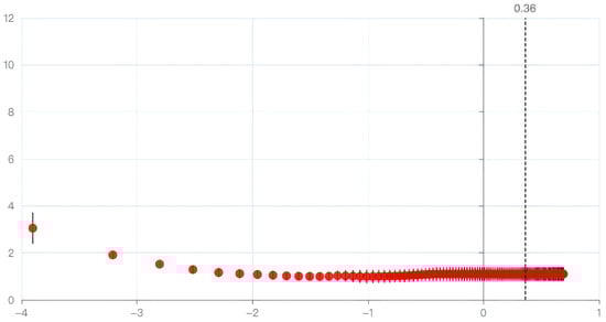 Cross-validation for λ selection. Red dots represent individual predictors’ coefficients. The vertical dashed line at λ = 0.36 indicates the optimal value, beyond which most coefficients approach zero.