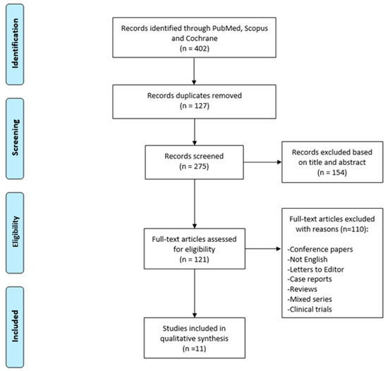 Overall, 402 papers were identified. After duplicate removal (127 papers), exclusion of off-topic papers (154) and for other structural reasons (110), papers were assessed for eligibility; finally, only 11 papers were included and summarized in the present systematic review. The eligible papers included in this systematic review have a publication range from 2013 to 2023. All investigated studies were published by authors from North America, Australia, New Zealand, Europe, and China.