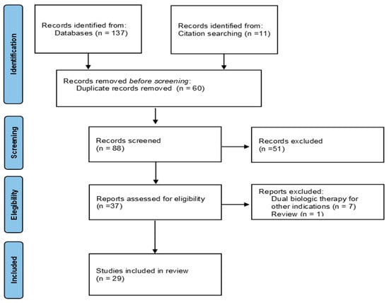 The initial literature search generated 137 potentially eligible articles from the aforementioned databases, plus 11 records identified by manual search. A total of 60 duplicates were identified and removed. After excluding 59 articles (51 off-topic, 1 review, and 7 about combining asthma-approved biologic agents with other monoclonal antibodies for different therapeutic indications), only 29 articles were included in this review according to the prespecified inclusion and exclusion criteria. A flow chart showing the study selection is presented in Figure 1. The data derive from 28 real-world studies and 1 clinical trial. A total of 27 studies took into consideration adult patients, while 2 case reports described pediatric patients. Table 1A–D summarizes the studies included in this review. The characteristics of the studies in which two biologics were administered for the treatment of uncontrolled severe asthma are presented in Table 1A. Two studies in which cycling biologic therapy was used are summarized in Table 1B. The cases in which dual therapy was given for severe asthma and type 2 comorbidities are presented in Table 1C,D. This illustrates the characteristics of 4 studies in which a dual biologic therapy was administered to deal with dupilumab-induced hypereosinophilia and eosinophils-related disorders, including cases of eosinophilic granulomatosis with polyangiitis (EGPA).