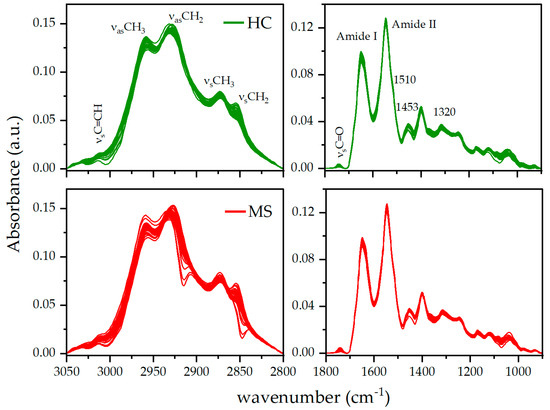 Figure 1 shows the ATR-FTIR spectra of MS patients and HC in the two most significant regions: 3050–2800 cm−1, containing the symmetric and asymmetric stretching vibrations of CH2 and CH3, and the fingerprint region in the 1800–900 cm−1 range, where the most prominent peaks are the amide I and amide II peaks that are due to the absorption band of proteins.