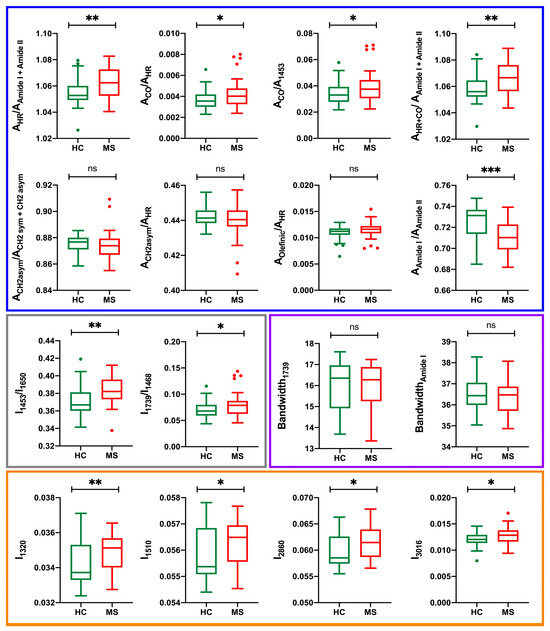 Box-plot of the spectral parameters derived from the analysis of the ATR-FTIR absorption spectra, illustrating the distribution of their values in the HC and MS groups. The p-value is indicated as * (p ˂ 0.05); ** (p ˂ 0.01); *** (p ˂ 0.001).
