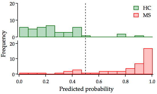 Considering the obtained values for the selected indicators, a classification for each subject can be obtained and compared with their real health status, to assess the capability of the model in distinguishing between patients and controls. A comparison of the predicted probability distributions within the HC and MS groups is shown in Figure 3. The plot clearly shows a very good performance of the model, with the clustering of the HC subjects on the left and the MS on the right of the cutoff dashed line at 0.5. The misclassified subjects in both groups are only a few samples and these are located, respectively, to the right and to the left of the threshold value.