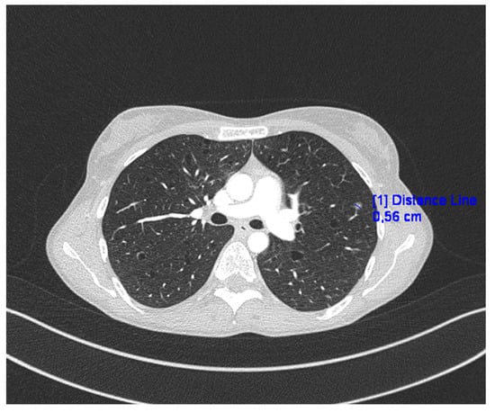 The pathogenesis of LAM is unclear. LAM can be divided into sporadic and tuberous sclerosis-associated forms. Both forms of the disease can cause pulmonary symptoms. Extrapulmonary LAM has the same morphological features as pulmonary LAM and may occur concomitantly with or precede it []. In patients with LAM, it is characteristic that lung function deteriorates [,,]. In the presented case, the patient’s symptoms were chyaloperitoneum and the presence of enlarged lymph nodes in the abdominal cavity. She had no typical pulmonary symptoms. Such a rare cases of extrapulmonary lymphangioleiomyoma (E-LAM) was described earlier in the literature [,,,].