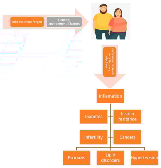 Adipocytes, preadipocytes, fibroblasts, stromal cells, and macrophages comprise adipose tissue, a subclass of connective tissues [23]. According to the findings of this research, adipose tissue contributes to body homeostasis [24,25,26]. Adipose tissue secretes chemicals that regulate the body’s energy, lipid, and glucose metabolism, as well as immune system activities [27]. When fatty tissue no longer performs its hemostatic duties in an abnormal circumstance, such as obesity, this leads to the dysregulation of the mechanisms responsible for maintaining the stability of the internal environment and the activation of processes underlying the emergence of numerous metabolic disorders (MDs) [28]. Figure 1 illustrates the adipokine dysregulation pathway that might result in MDs and long-term problems during obesity [29].