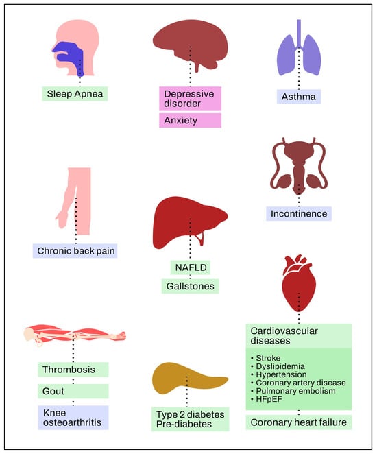 Figure 3 shows that the comorbidities can be classified into three major classes: metabolic, like cardiovascular diseases, type 2 diabetes, nonalcoholic fatty liver disease (NAFLD), breast, colorectal, endometrial, esophageal, kidney, ovarian, pancreatic, prostate, and gastro-esophageal reflux disease, as well as heart failure with preserved ejection fraction; mechanical, such as asthma, chronic back pain, and knee osteoarthritis; and mental, such as depression and anxiety [46].