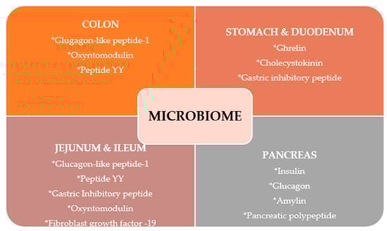 As it can be seen from Figure 4, the signal release is influenced by nutrient intake, bile acids, and the gut microbiome [50].