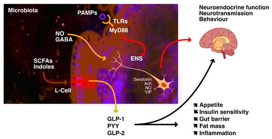 Gut microorganisms use different strategies to communicate with host cells. Short-chain fatty acids are byproducts of microbial fermentation of various nutrients; these SCFAs are detected by specific G-protein-coupled receptors that are expressed on the surface of enteroendocrine cells such as L-cells and result in the production of GLP-1, GLP-2, and PYY. Additionally, indoles, which are bacterial byproducts of tryptophan breakdown, regulate GLP-1 secretion and hunger [77].