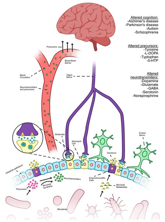 Certain neurotransmitters are involved in the interaction between the gut microbiota and the host, and they are influenced by the control of their precursors [63]. Additionally, it explores the role of intestinal enteroendocrine cells in the synthesis and release of neurotransmitters, which are facilitated by microbial activity [18].