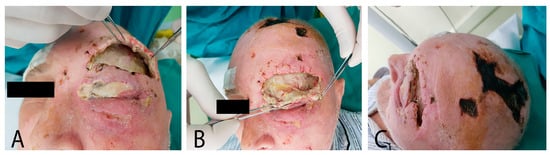 The patient’s overall health was significantly compromised, manifesting as pronounced edema affecting the left hemiface, particularly the upper eyebrow and eyelid, in the infraorbital regions, with extension to the occipital region, accompanied by areas of tissue necrosis. Deep-seated devitalized and infected tissues were observed in the wounds located at the left eye and upper eyelid, along with the presence of viscous, yellowish discharge. Additionally, substantial subcutaneous emphysema was noted. Furthermore, an approximately 10/7 cm area of necrosis was estimated in the vertex region of the patient’s scalp (Figure 1). Subsequently, the patient was transferred to the Plastic and Reconstructive Microsurgery Clinic.