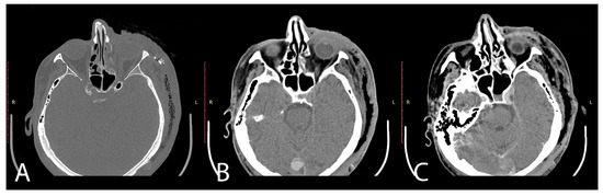 MRI examination: (A–C) subcutaneous emphysema and edema of the left hemiface.