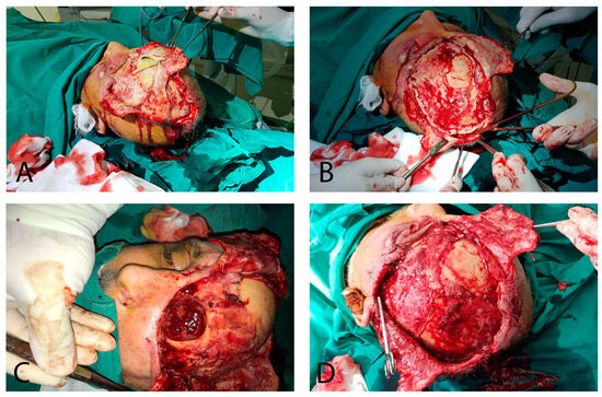 Given the patient’s local clinical presentation and overall medical condition, an urgent surgical intervention was necessary (CK = 2150/U/L, CRP = 43.11/mg/dL, WBC = 20.57 × 103/µL). Under general anesthesia with orotracheal intubation, a multidisciplinary surgical approach involving plastic surgeons and ophthalmologists was executed. The surgical procedure comprised several pivotal stages: in the initial phase, extensive surgical debridement was performed, involving the removal of all necrotic and devitalized tissues, including the enucleation of the left eyeball, fasciectomy, and parieto-occipital necrectomy. Subsequently, this intervention exposed the parietal bone (Figure 3). The excised pieces were sent for histopathological examination, confirming the diagnosis.