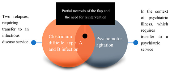 Microbial agents present in such pathologies are diverse, including Group A beta-hemolytic streptococci, MRSA (Methicillin-resistant Staphylococcus aureus), Klebsiella pneumoniae, Pseudomonas aeruginosa, Staphylococcus epidermidis, Streptococcus milleri group, Acinetobacter sp., Enterobacter cloacae, and fungi. In the reported case, Acinetobacter cloacae was implicated, and, during hospitalization under antibiotic treatment, the patient developed a secondary infection with Clostridium difficile, leading to a transfer to an infectious disease unit [12,25,26,27,28,29,30,31]. This led to the discontinuation of surgical treatment, exacerbating the immunosuppressive state and pre-existing imbalances [24,32,33,34,35].