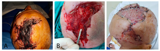 (A) Parieto-occipital fascial flap necrosis. (B) Surgical approach after parieto-occipital fascial flap necrosis—periosteal removal. (C) Immediate postoperative results.