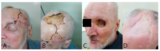 Following the fifth day of postoperative care, during which the patient’s overall health had significantly improved and achieved a state of balance, a secondary suture was performed. Subsequently, we proceeded with the coverage of the exposed parietal bone using a rotation fascial flap and a free split-thickness graft, using a similar approach as in orbital cases.