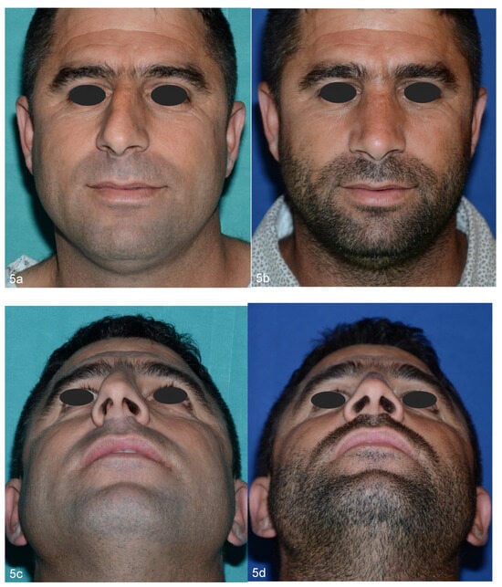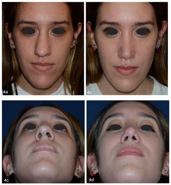 This is in accordance with our FACE-Q scores which showed higher satisfaction of patients who underwent double osteotomies, particularly with regards to the width of the nose and how the nose suited the face. Moreover, Westreich and Lawson underlined that a double lateral osteotomy prevents the occurrence of palpable or visible ledges of maxillary bone which could result from a conventional single lateral osteotomy when there is a thick and prominent attachment of the frontal process of the maxilla to the nasal bones. Both reviewers and patients, through the questionnaires, particularly appreciated the aesthetic outcome in terms of nose width, how the nose suited the face, the overall size of the nose and how the nose looks in photographs. We believe that this is due to a more favorable ratio between the width of the nose and the face, given the decrease in the space of the nasal bone base in favor of a greater malar extension. With a single osteotomy, it is possible to close the open roof, but the malar extent does not increase as it is still limited by the bulging of the frontal processes of the maxilla. With double osteotomies, these structures instead contribute to the bone base of the nose, visually enlarging the malar space and giving the nose an even more natural and less “surgical” appearance (Figure 4a–d and Figure 5a–d).