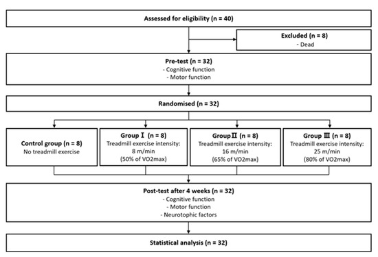 Our animal experiments were approved by the Animal Care Committee of Daegu University (DUIACC-2017-9-0216-007). Forty male Sprague Dawley rats aged 10 weeks were used in this study. Thirty-two of the animals were used in the experiments, while eight of the animals were killed immediately after AD induction. The rats were numbered and randomized using an Excel random draw method. The rats were randomly assigned to control (CG, n = 8), low-intensity (Group I, n = 8), medium-intensity (Group II, n = 8), and high-intensity (Group III, n = 8) exercise groups (Figure 1). All the rats had free access to standard food (Cargill Agri Purina, Seongnam, Republic of Korea) and water in a controlled environment (12 h light/dark cycle, 23 ± 2 °C with 50% relative humidity) [26].