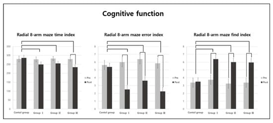 The 8-arm radial maze test measures working ability and spatial memory, which correspond to the rats’ cognitive function. The tool had a radial shape and comprised eight passages with a size of 12 × 60 cm leading from the central starting point. Each maze is 30 cm high to prevent the rats from escaping. Food, which was provided as a reward, was placed at the end of a passage (arm), and learning was conducted after the rats were fasted for 24 h before entering the maze. After learning, the rats were fasted again for 24 h and then tested. In the test, they were allowed to move freely through the maze and eat any food they found at the end of a passage. The time the experimental animals took to accurately find food in all eight passages within 5 min was measured. Repeatedly entering the same passage was evaluated as an error, and the number of times this happened was measured; the number of times the rat accurately searched for food before the first error occurred was also measured.