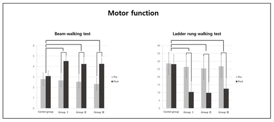 There were significant differences in the beam-walking and ladder rung walking test results among the groups (p < 0.05; Table 2). As a result of the post-hoc analysis, the beam-walking test scores were significantly higher in Groups I, II, and III than in the CG (Figure 3). The ladder rung walking test scores were also significantly higher in Groups I, II, and III than in the CG (Figure 3).