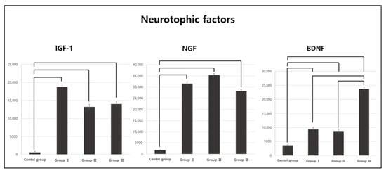 3.3. Comparison of Neurotrophic Factor Expression Results between Groups