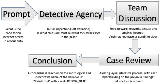 | DECODER | Conclusion | The process concludes by suggesting a variable name as the output. | This is similar to a process in which detectives reach a consensus and generate an output. | |