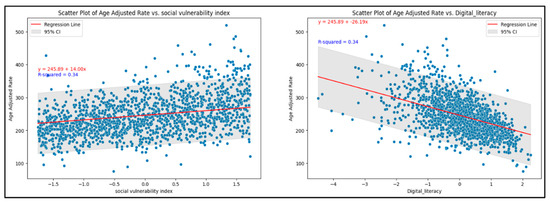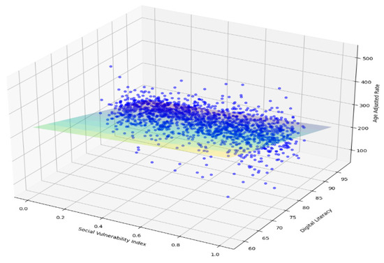 | Social Vulnerability Index | Digital Literacy | Predicted Age-Adjusted Mortality Rate per 100,000 (OLS Model) | Predicted Age-Adjusted Rate per 100,000 (LGBMregressor) | |
