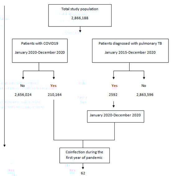 Flowchart showing the total study population, patients diagnosed with COVID-19, patients diagnosed with pulmonary TB, as well as patients with coinfection of these two diseases during the first year of the pandemic.