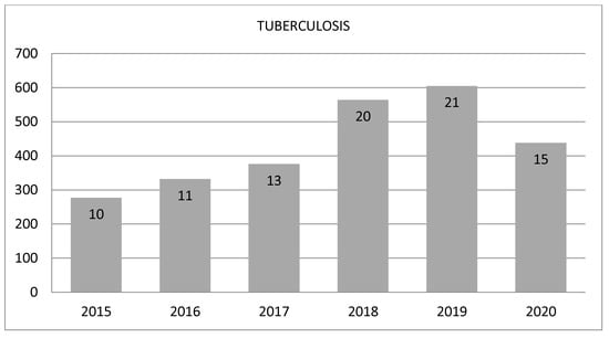 From January 2020 to December 2020, a total of 210,164 (11.1%) patients were diagnosed with COVID-19. That same year, a total of 438 (0.02%) patients were diagnosed with pulmonary TB, 59.5% of which were male with a mean age of 55.0 years (95%CI 53.4–56.7), and 40.5% were female with a mean age of 53.9 years (95%CI 52.6–55.2). Figure 2 shows the evolution of TB diagnoses annually since 2015. Above the columns, the number of patients diagnosed with pulmonary TB per 100,000 inhabitants is shown. A higher incidence of pulmonary TB was not observed in the first year of the pandemic; instead, a 28% reduction was observed compared to 2019.