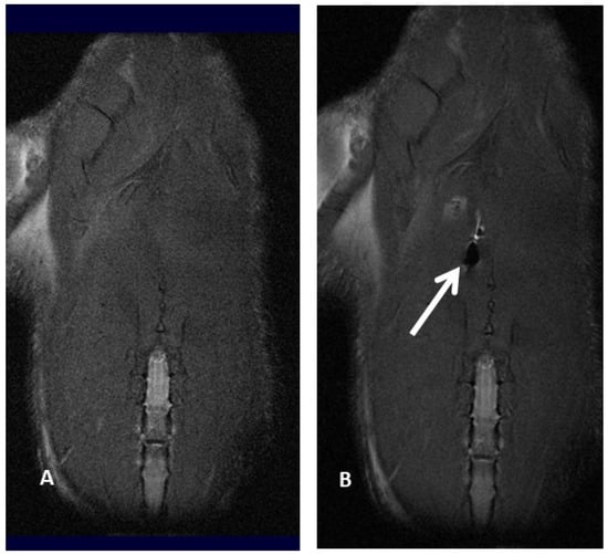 Magnetic resonance imaging of a rat before (A) and after (B) injection of ferumoxides labeled mesenchymal stromal cell, resulting in an apparent loss of signal (white arrow and black hole).