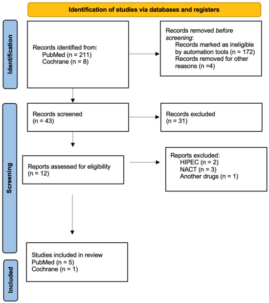 The search strategy obtained a total of 211 publications in PubMed and 8 in Cochrane. After the removal of duplicates, the filtering of articles with electronic tools, and the critical reading of the abstracts, five articles in PubMed and one article in Cochrane were selected. Six articles were included in this review for overall survival and five articles for disease-free survival. Figure 1 shows the selection process.