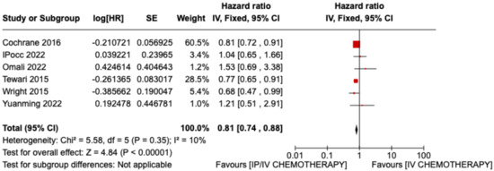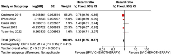 Similarly, the disease-free interval was significantly greater in the group of patients who underwent intraperitoneal chemotherapy in addition to intravenous chemotherapy (Figure 3) (HR 0.81, CI 95% 0.75–0.87, p < 0.00001).