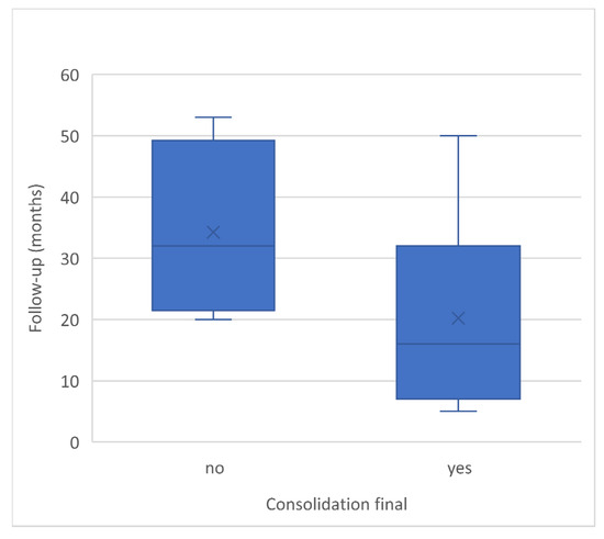 Patients who did not achieve final consolidation had an average follow-up duration of 34.25 months, with a standard deviation of 14.57 months. The median follow-up time was 32.00 months, with a minimum of 20 months and a range of 33 months. On the other hand, patients with consolidated non-unions had an average follow-up period of 20.11 months, with a standard deviation of 15.69 months. The minimum follow-up time was 5 months, and the range extended to 45 months, with a median follow-up duration of 16.00 months. (Figure 4). In total the mean time from non-union surgery to-consolidation for patients with final union was 14.91 ± 6.70 months and a median of 14.08 months. The time from trauma to consolidation showed a mean of 36.56 months ±13.60 and a median of 34.00 months (Table 2). The shortest duration between trauma and the initial non-union surgery at our clinic was 9 months, while the longest was 25 months. The average time for the entire group was 16.50 months with a standard deviation of 5.30 months, within a range of 16 months.