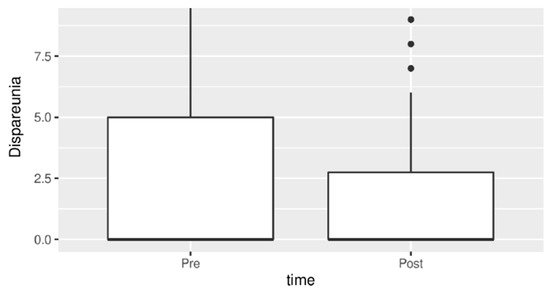 Chronic pelvic pain and dyspareunia also showed a statistically significant reduction after therapy as seen in Figure 3 and Figure 4.