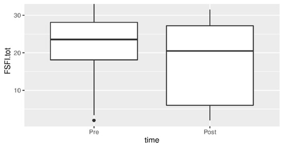 The analysis of the questionnaires highlighted that there was no statistically significant difference regarding the improvement of the score of the SF36 questionnaire and each of the related items. There was no statistically significant difference from T0 to T6 in STAI values. Instead, there was a statistically significant difference from baseline in the FSFI score, as illustrated in Figure 5.